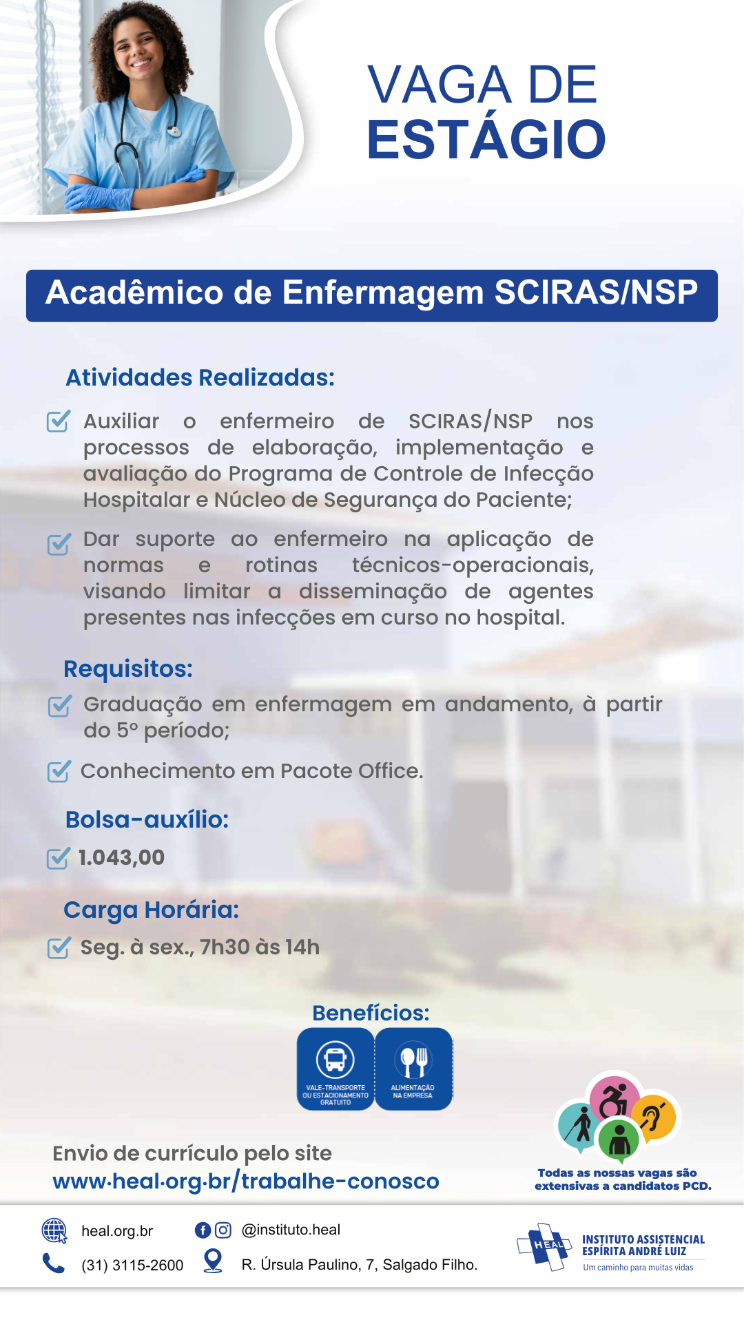 Requisitos: Graduação em enfermagem em andamento, à partir do 5° período; Conhecimento em Pacote Office.