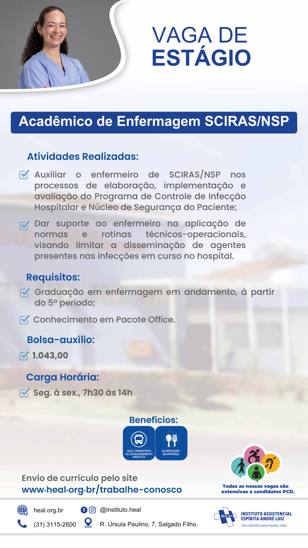 Atividades: Auxiliar o enfermeiro de SCIRAS/NSP nos processos de elaboração, implementação e avaliação do Programa de Controle de Infecção Hospitalar e Núcleo de Segurança do Paciente; dar suporte ao enfermeiro na aplicação de normas e rotinas técnicos- operacionais, visando limitar a disseminação de agentes presentes nas infecções em curso no hospital.