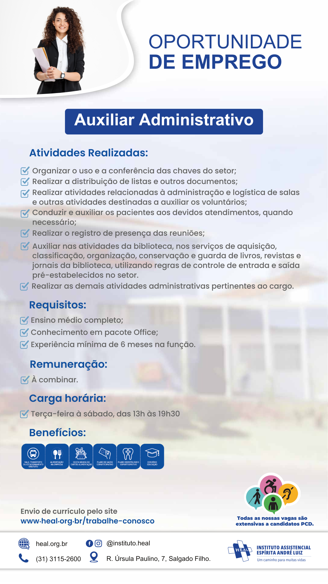 Atividades: Organizar o uso e a conferência das chaves do setor; realizar atividades relacionadas à administração e logística de salas e outras atividades destinadas a auxiliar os voluntários; conduzir e auxiliar os pacientes aos devidos atendimentos, quando necessário; realizar as demais atividades administrativas pertinentes ao cargo.