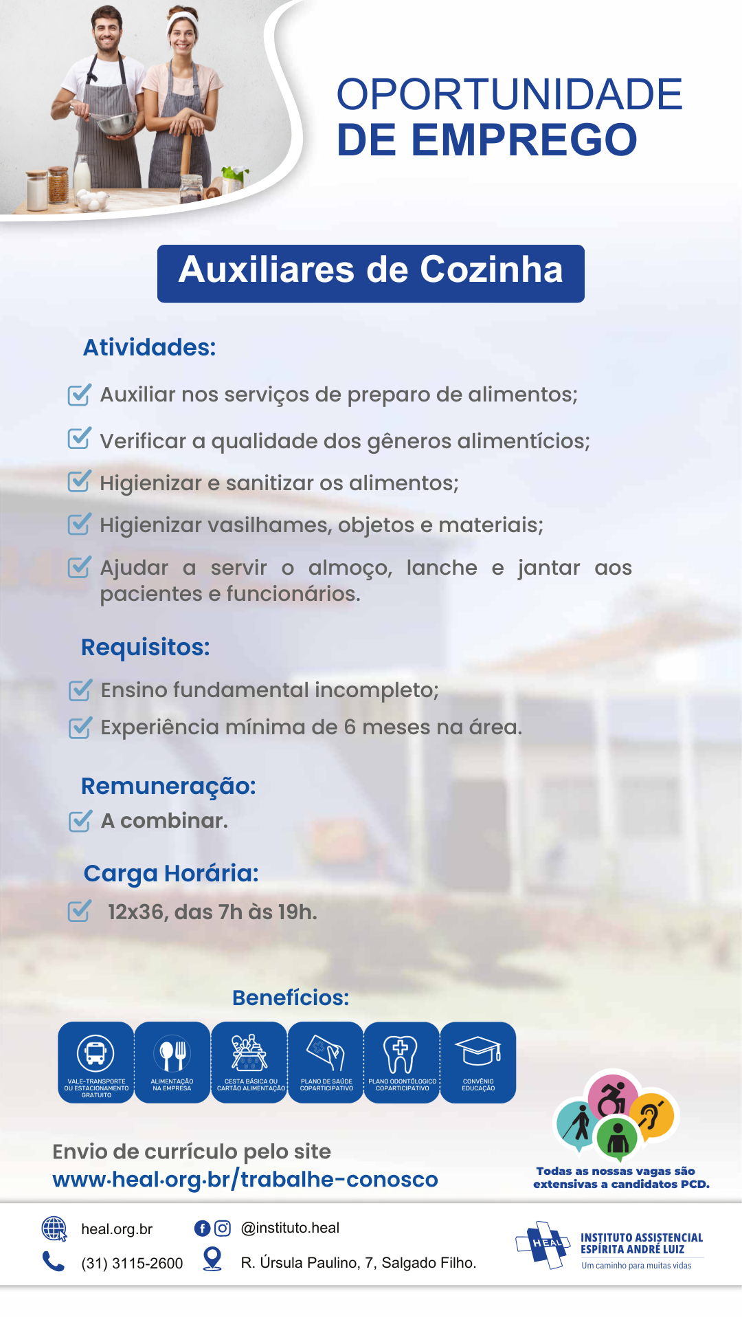 Atividades: Auxiliar nos serviços de preparo de alimentos; verificar a qualidade dos gêneros alimentícios; higienizar e sanitizar os alimentos; ajudar a servir o almoço, lanche e jantar aos pacientes e funcionários; higienizar vasilhames, objetos e materiais;