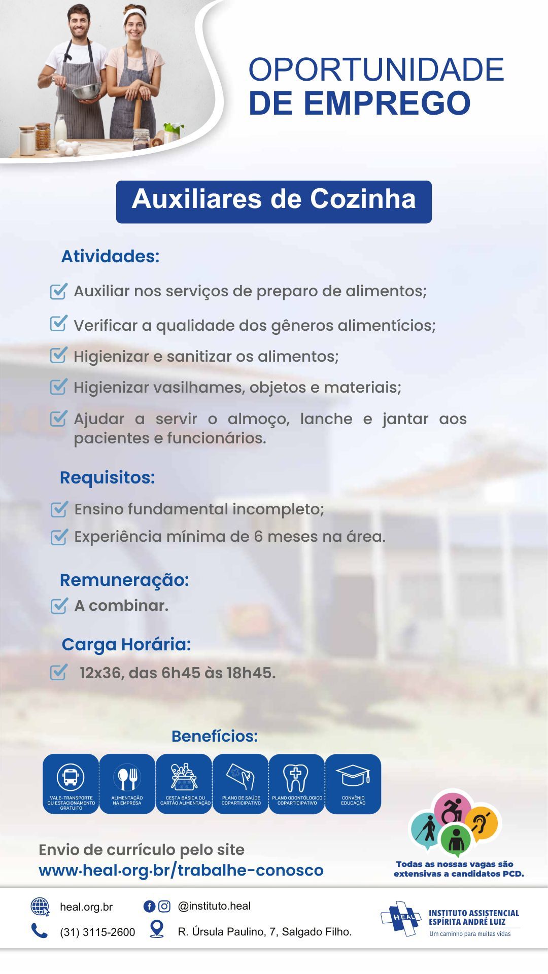 Atividades: Auxiliar no serviço de preparos de alimentos; higienizar e sanitizar os alimentos; higienizar vasilhames, objetos e materiais.