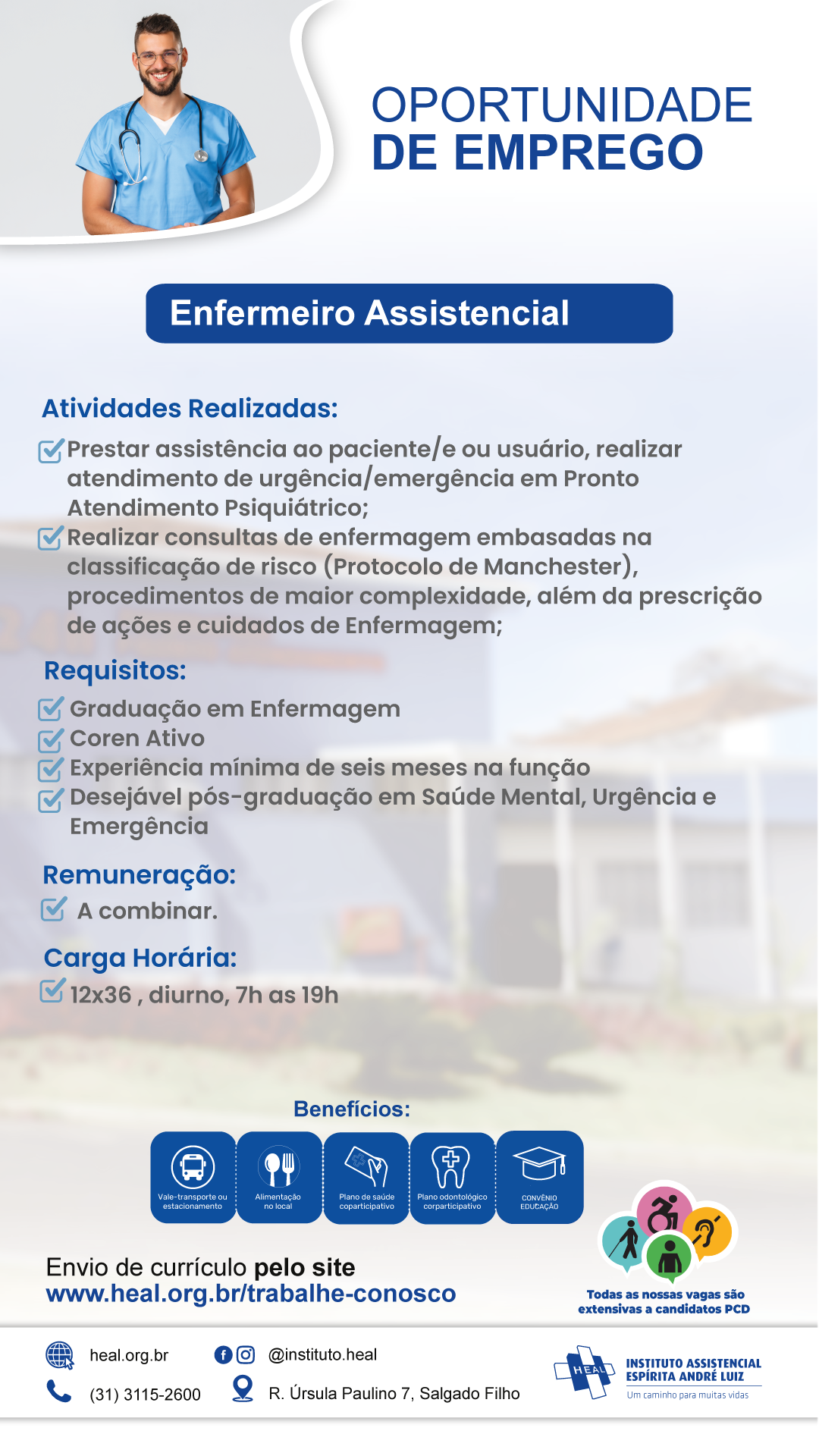 Atividades: Prestar assistência ao paciente e/ou usuário, realizar atendimento de urgência/emergência em Pronto Atendimento Psiquiátrico; Realizar consultas de enfermagem embasadas na classificação de risco (Protocolo de Manchester), procedimentos de maior complexidade, além de prescrição de ações e cuidados de Enfermagem.