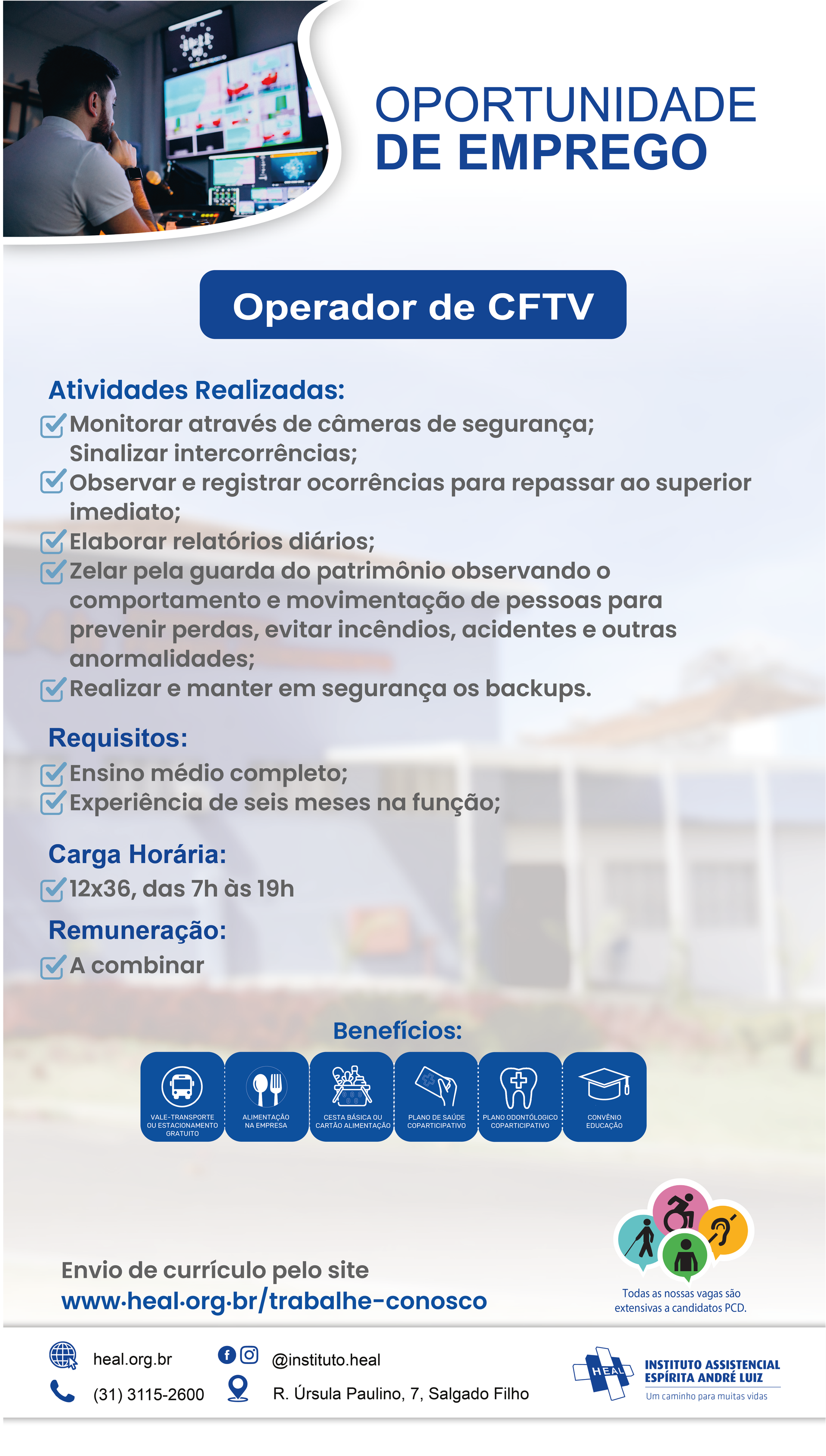 Atividades: Monitorar através das câmeras de segurança; sinalizar intercorrências; elaborar relatórios diários; realizar e manter a segurança dos backups.