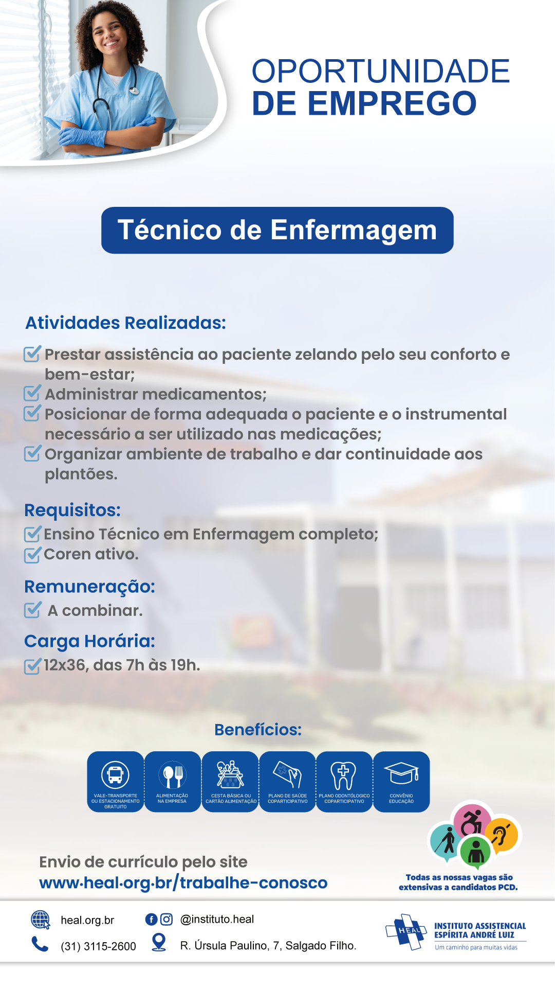 Requisitos: Ensino Técnico em Enfermagem completo; Coren ativo.