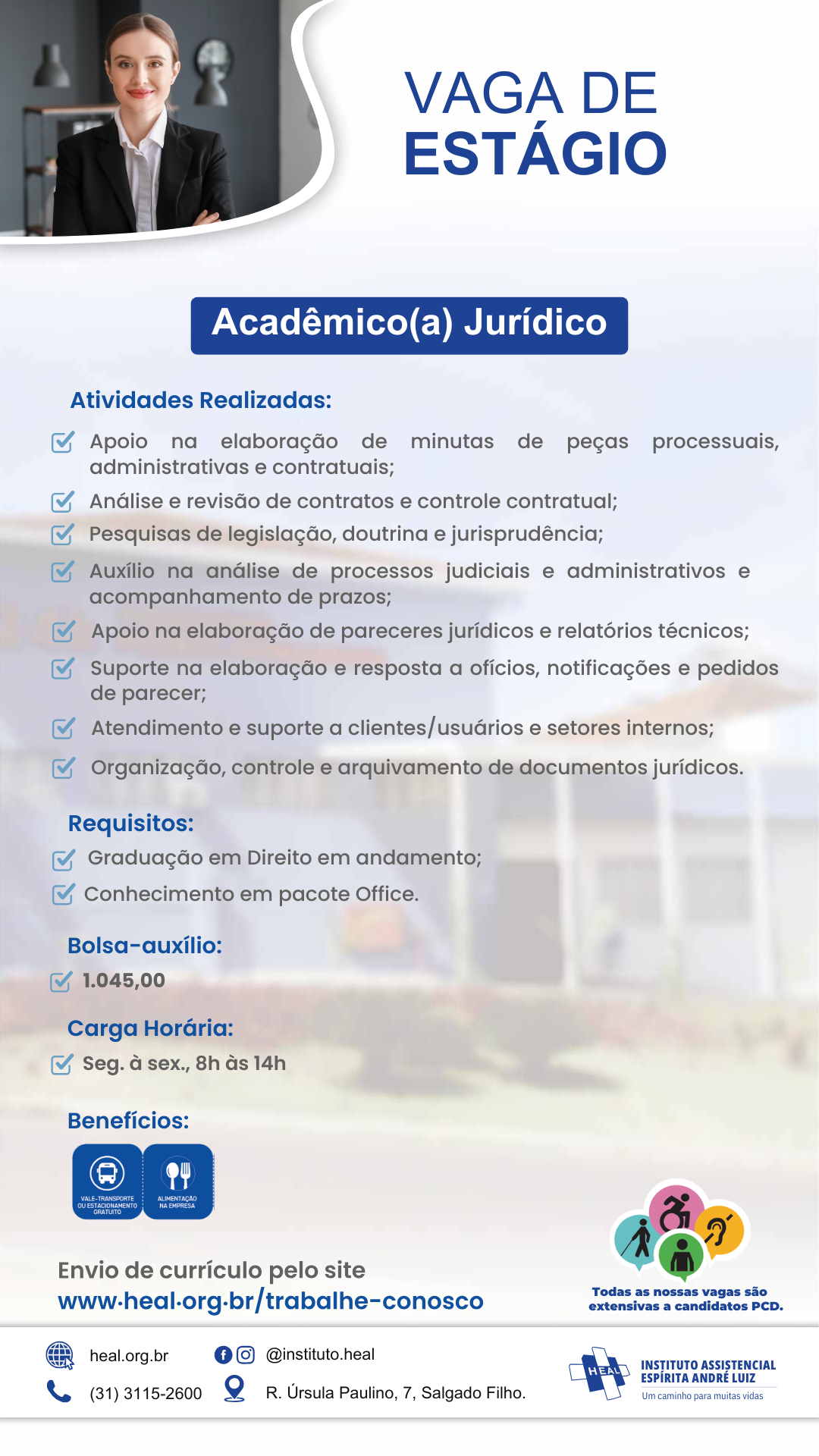 Atividades: Apoio na elaboração de minutas de peças processuais, administrativas e contratuais; Análise e revisão de contratos e controle contratual; Pesquisas de legislação, doutrina e jurisprudência; Auxílio na análise de processos judiciais e administrativos e acompanhamento de prazos; Apoio na elaboração de pareceres jurídicos e relatórios técnicos; Suporte na elaboração e resposta a ofícios, notificações e pedidos de parecer; Atendimento e suporte a clientes/usuários e setores internos; Organização, controle e arquivamento de documentos jurídicos.