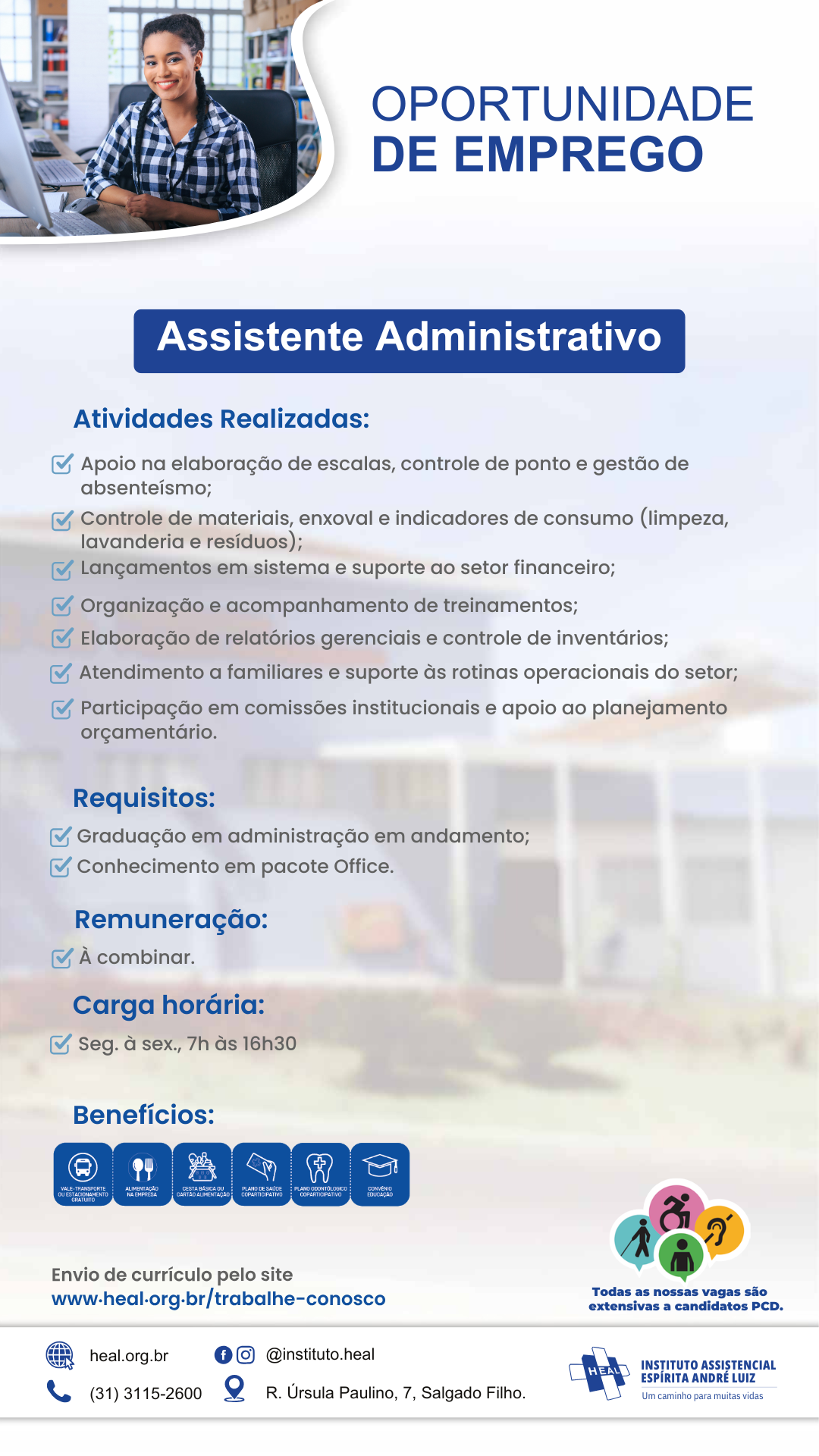 Atividades: Apoio na elaboração de escalas, controle de ponto e gestão de absenteísmo; Controle de materiais, enxoval e indicadores de consumo (limpeza, lavanderia e resíduos); Lançamentos em sistema e suporte ao setor financeiro; Organização e acompanhamento de treinamentos; Elaboração de relatórios gerenciais e controle de inventários; Atendimento a familiares e suporte às rotinas operacionais do setor; Participação em comissões institucionais e apoio ao planejamento orçamentário.