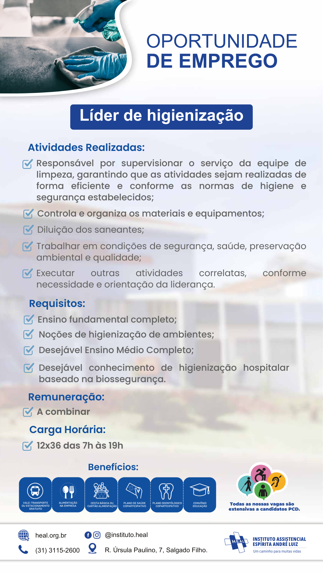 Atividades: Responsável por supervisionar o serviço da equipe de limpeza, garantindo que as atividades sejam realizadas de forma eficiente e conforme as normas de higiene e segurança estabelecidos. Controla e organiza os materiais e equipamentos. Diluição dos saneantes. Trabalhar em condições de segurança, saúde, preservação ambiental e qualidade. Executar outras atividades correlatas, conforme necessidade e orientação da liderança.